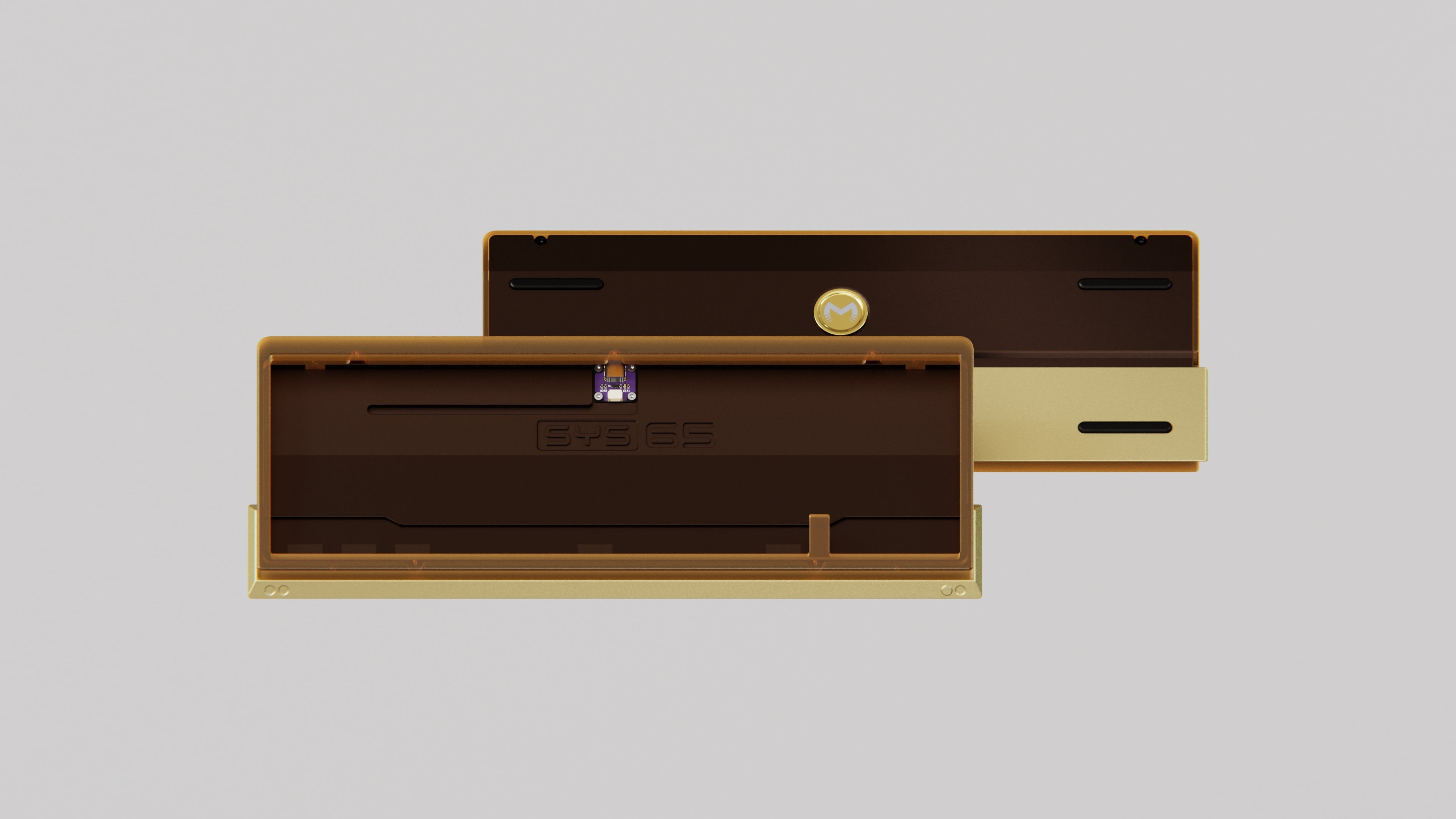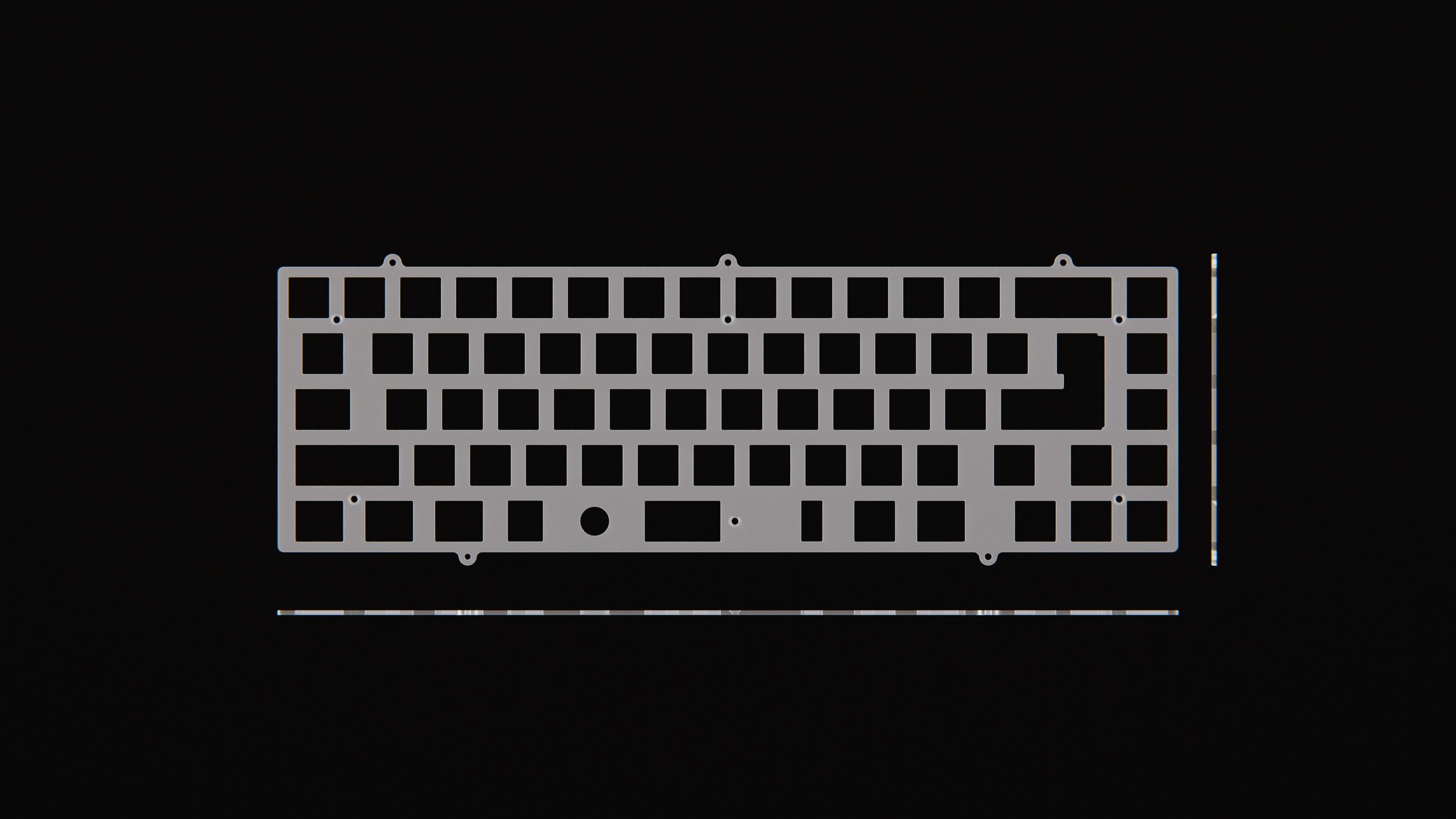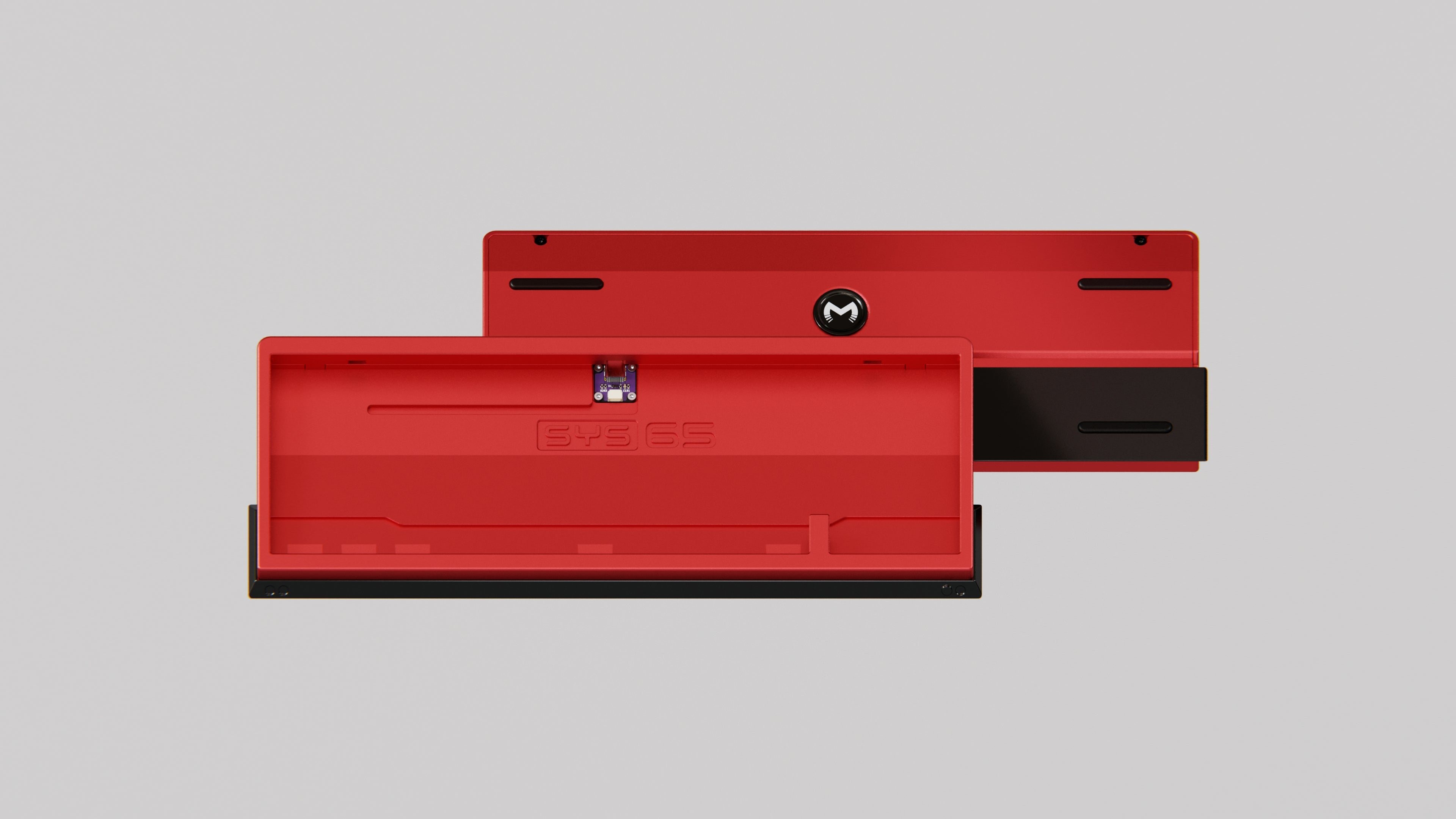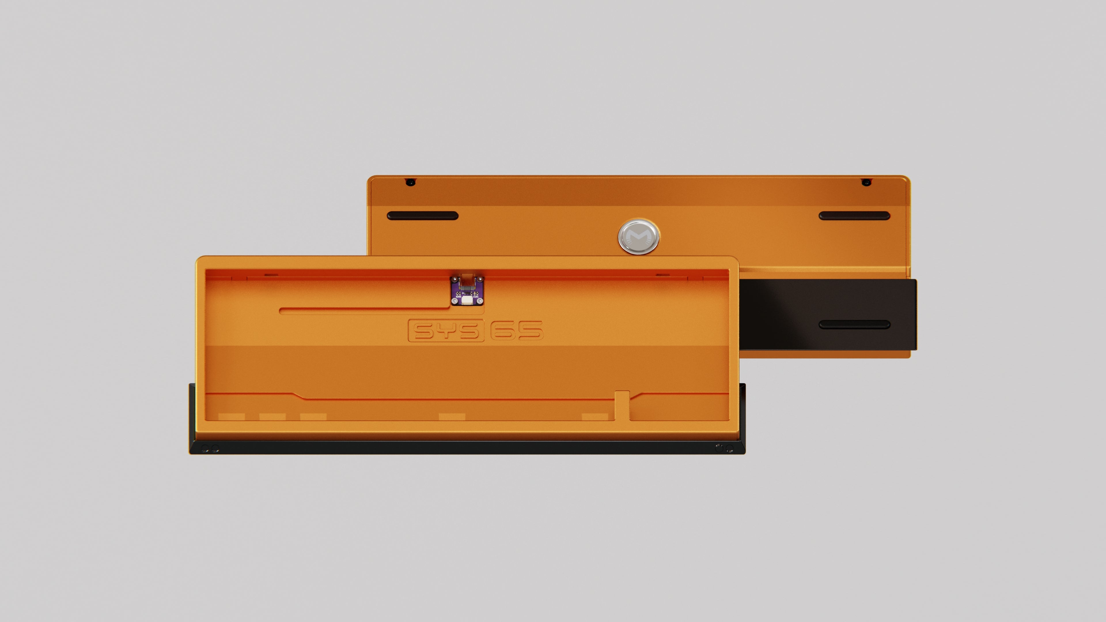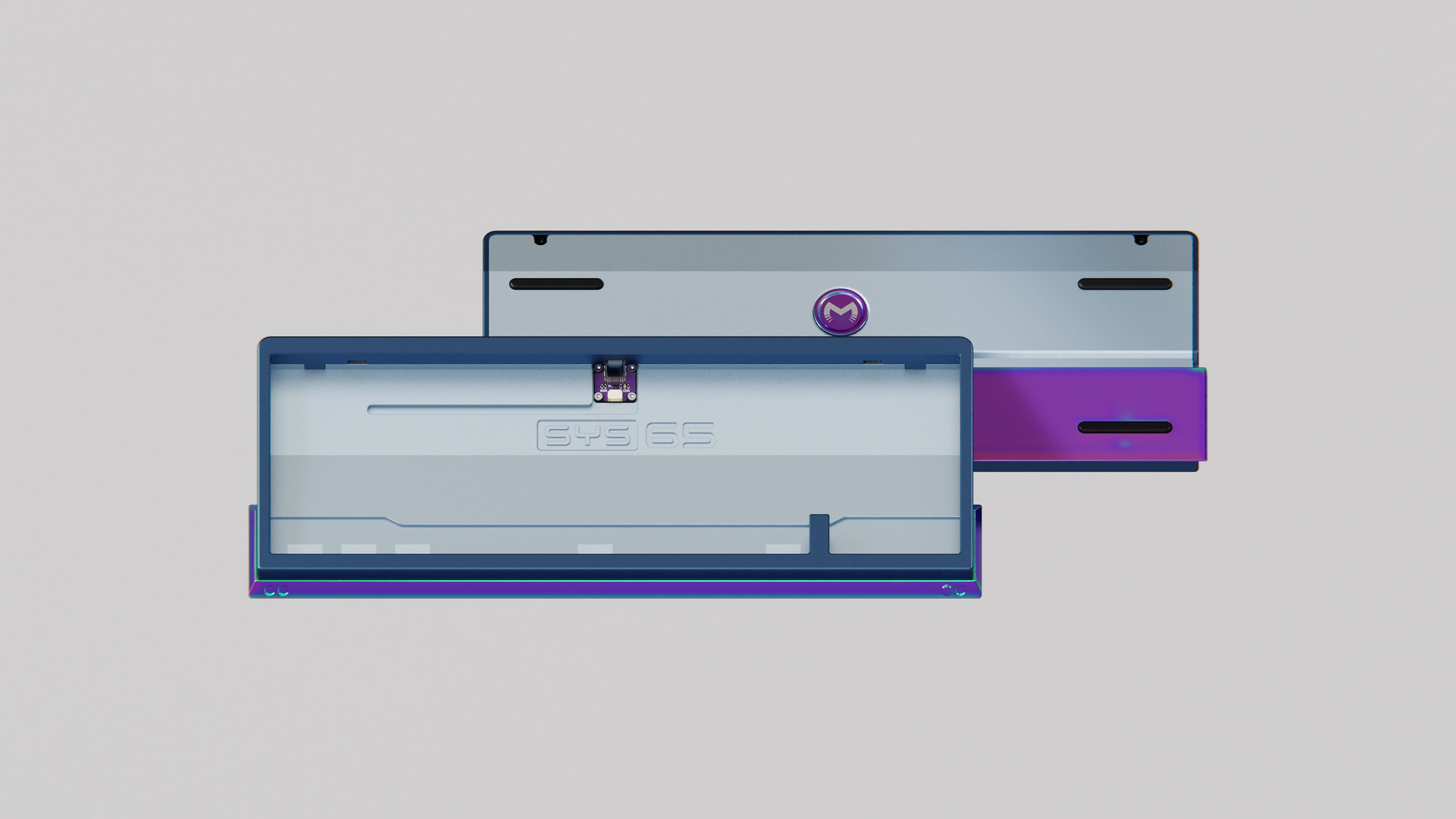 The design features an accent weight attached magnetically at the front of the keyboard, and a badge at the bottom. These two parts provide some customization and different colours/materials will be available as add-ons, including blank badges. The System_65 uses a top mounted switch plate, with switches and stabilizers sitting on top of a custom designed PCB (hotswap or solder), which offers a variety of layout options.