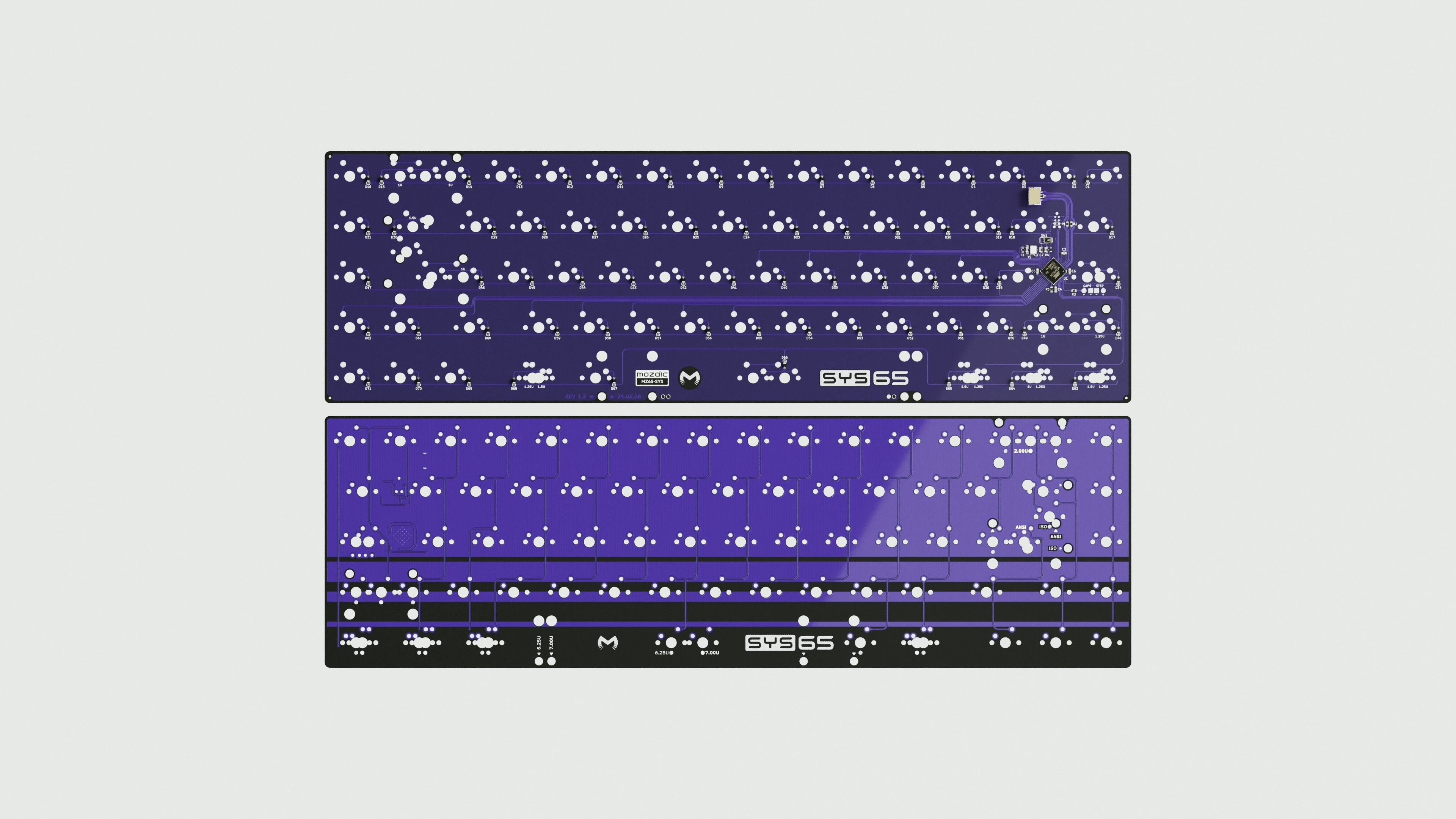 To accompany the goal of layout options, layout identifier dots are printed to mark the different options, most important for the bottom row. MZ65-SYS and hotswap MZ65×SYS. The only differences between the PCBs are the addition of caps-lock LED support for solder variant, and the colour of the solder mask: purple for solderable; and red for the hotswap variant.